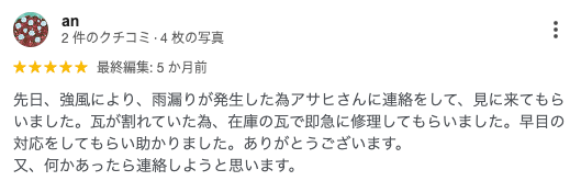 「先日、強風により、雨漏りが発生した為アサヒさんに連絡をして、見に来てもらいました。瓦が割れていた為、在庫の瓦で即急に修理してもらいました。早目の対応をしてもらい助かりました。ありがとうございます。又、何かあったら連絡しようと思います」