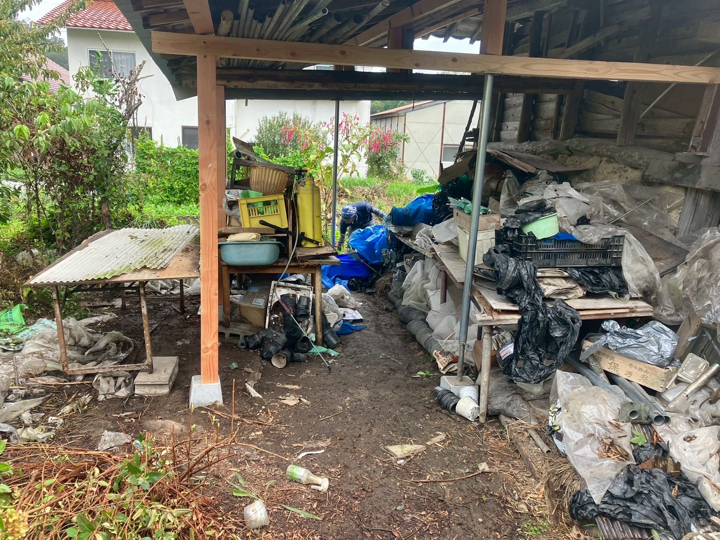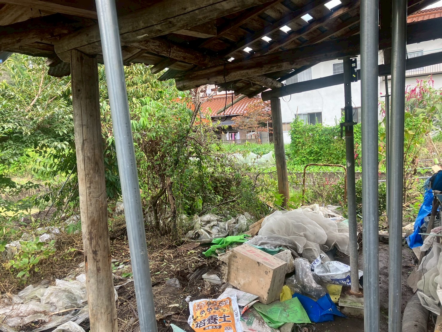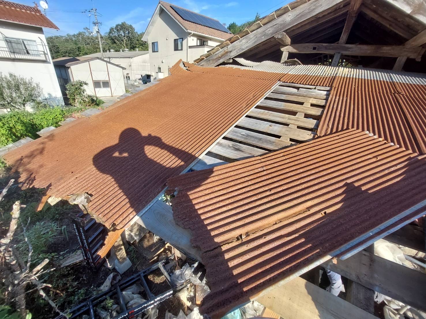 現場は築年数の経った古民家で、木製の柱や梁が腐食して屋根が沈み込んでおり、トタン屋根もサビや穴が目立ち、雨漏りの被害が出ている状態でした。