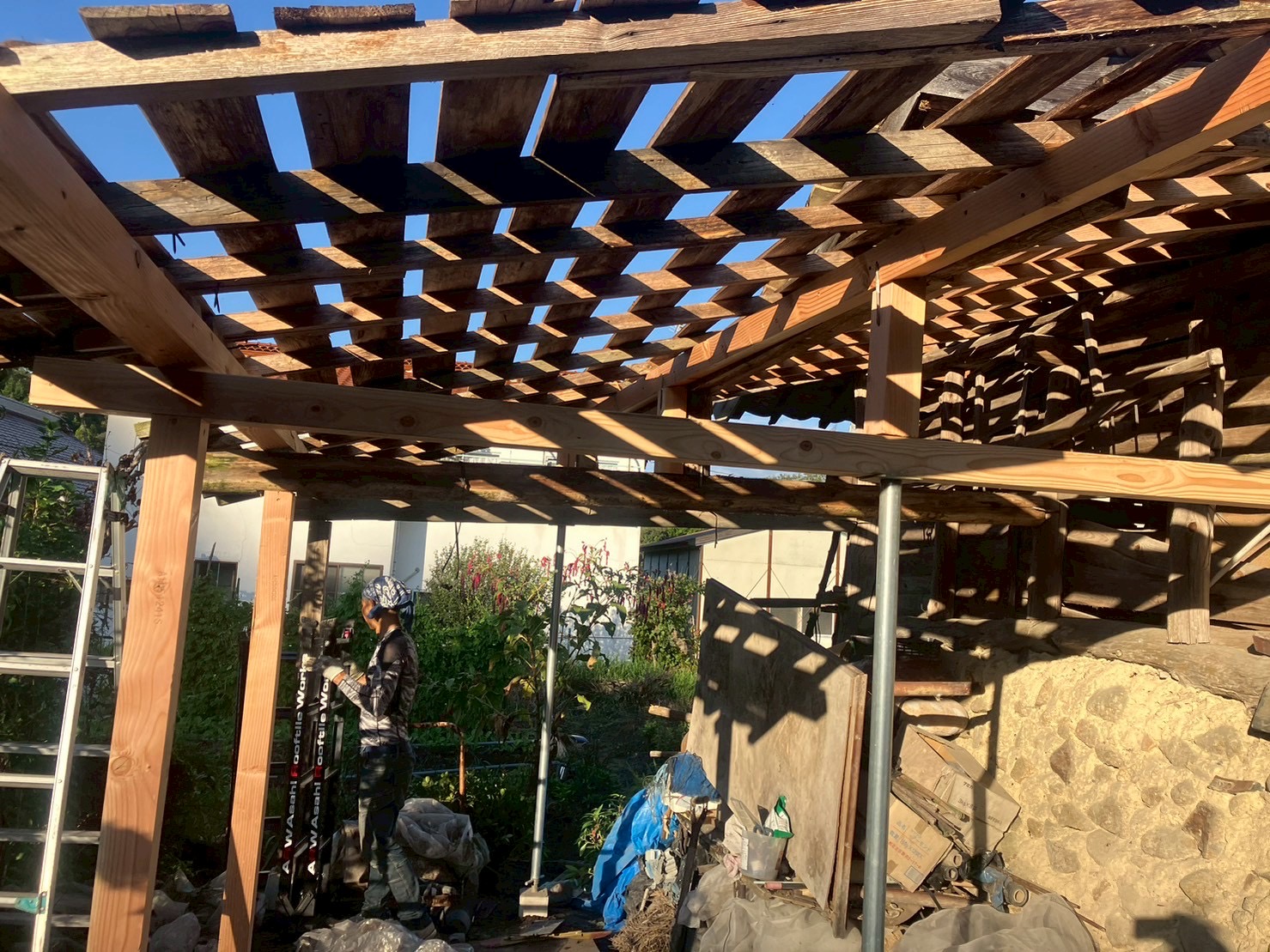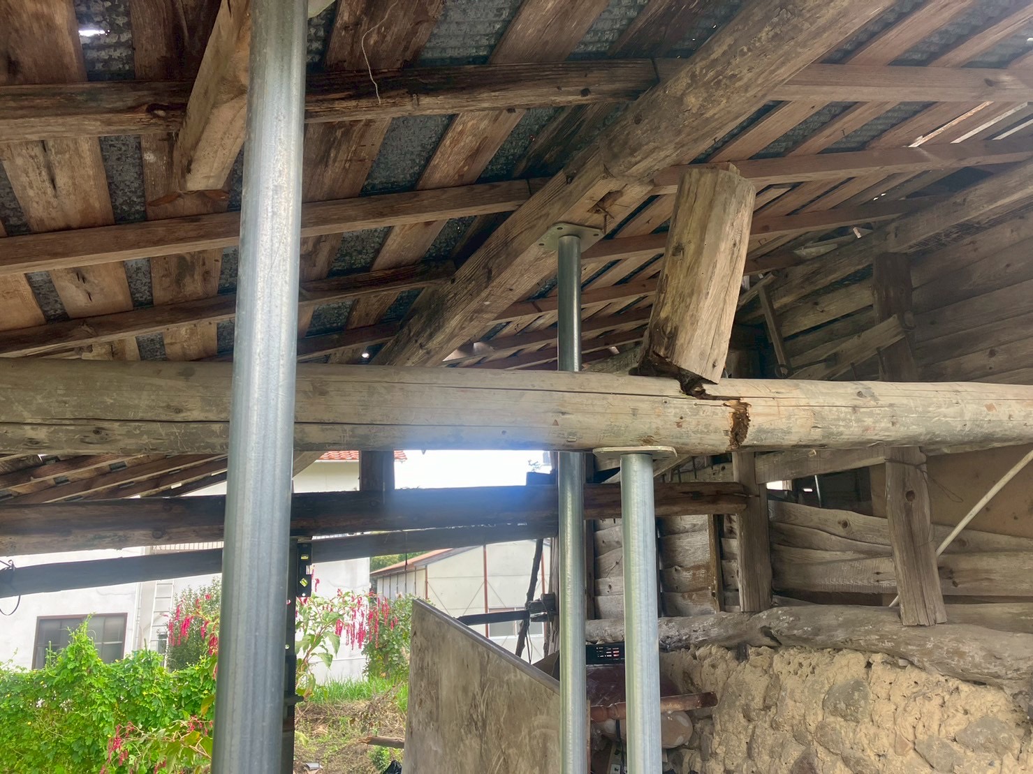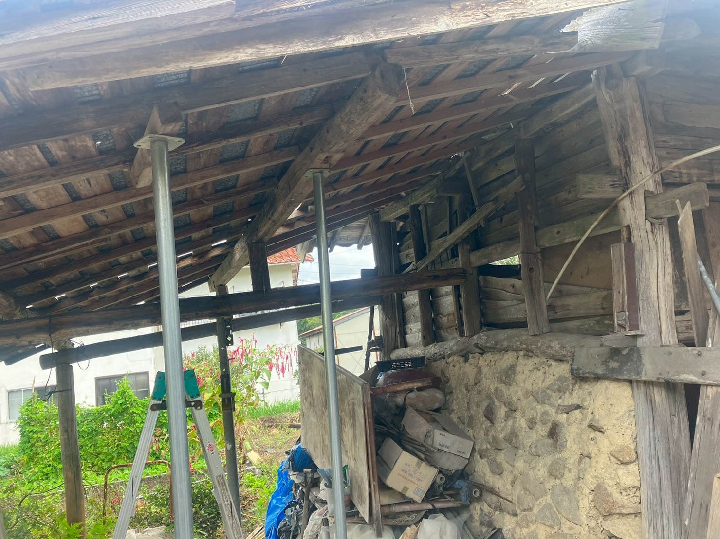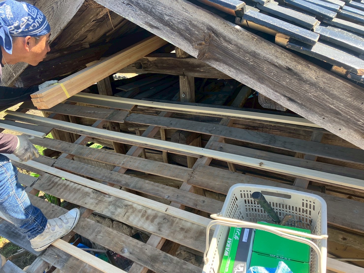 まずは、傾いた屋根の構造体をジャッキで支え、腐食した梁や柱を無垢材で補強しました。